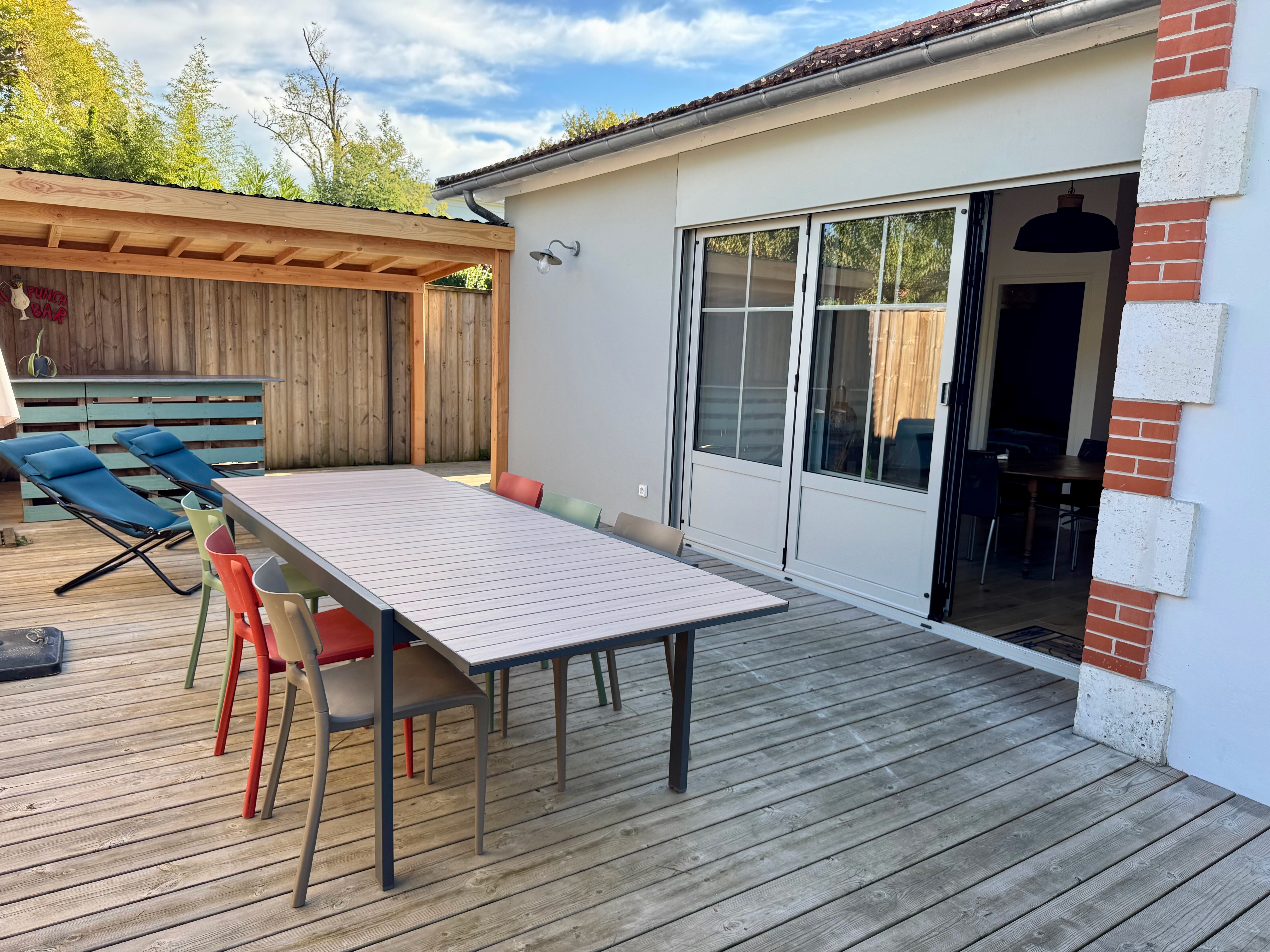 Villa Violette, arcachonnaise chic à deux pas de la plage du Bétey. Entièrement rénovée avec une extension moderne, elle mêle charme d’époque et lignes contemporaines. Posez la voiture, tout se fait à pied : plage, balades, cafés et vie andernosienne. Élégante, calme, pratique, le séjour parfait commence ici.